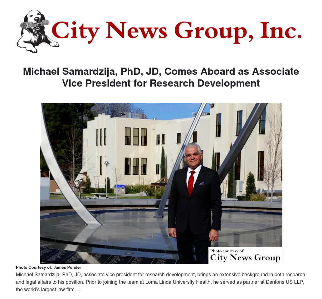 LOMA LINDA >> Michael Samardzija, PhD, JD, joined the Loma Linda University Health department of research affairs as associate vice president for research development earlier this year.