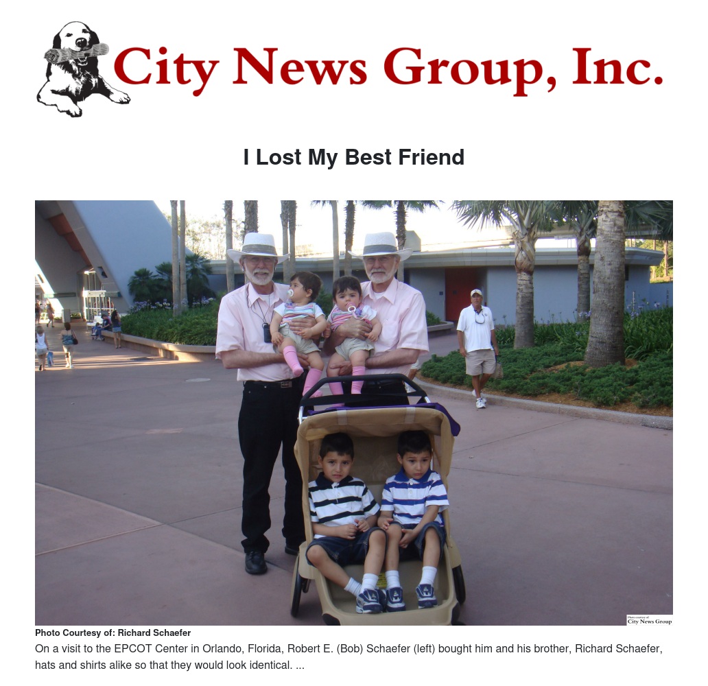 LOMA LINDA>> Robert E. (Bob) Schaefer died on Dec. 30, 2016. He was my best friend. We both enjoyed being identical twins, but he really enjoyed it. On a visit to the EPCOT Center in Orlando, Florida, he bought us hats and shirts alike so that we would look identical. Some people must have thought we were members of the staff, because they asked if they could pose for pictures with us. Every time he saw some little people who looked alike, he would ask their parents if they were identical twins. None were, until we started to leave the park.