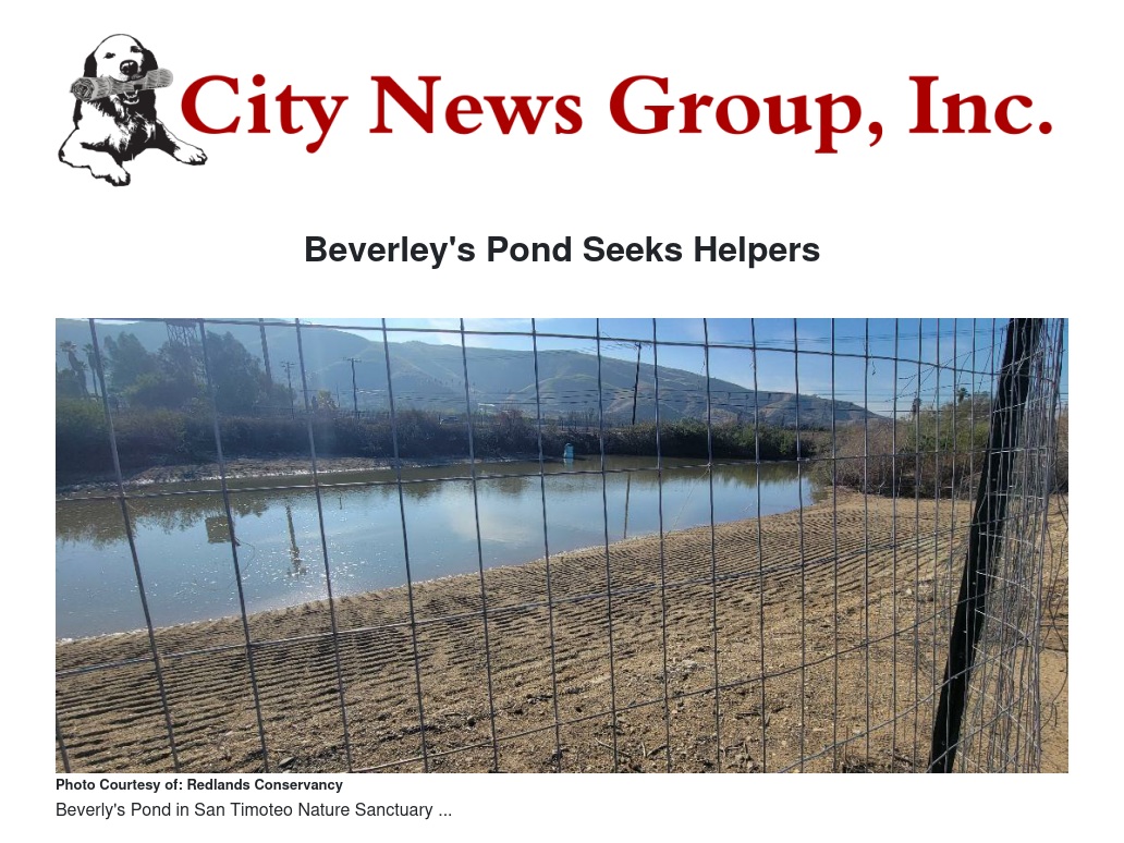 After several years of being dry and filled with weeds, Beverley's Pond at the west end of San Timoteo Nature Sanctuary is full of water (instead of weeds) and is attracting avian fauna. The birds are happy, and we're happy. But the pond won't take care of itself. We must keep invasive weeds from taking over again, prevent sediment from filling it up again, and make sure the water has the right amounts of natural ingredients to keep it healthy. You have an opportunity to be part of making this treasure regain its status as a birding hot-spot. Simply join the Pond Team. We will meet only quarterly, each team member will have a specific task to do, and it won't cost you a thing. And you will learn from experts. Call Sherli at 909 782-6208.