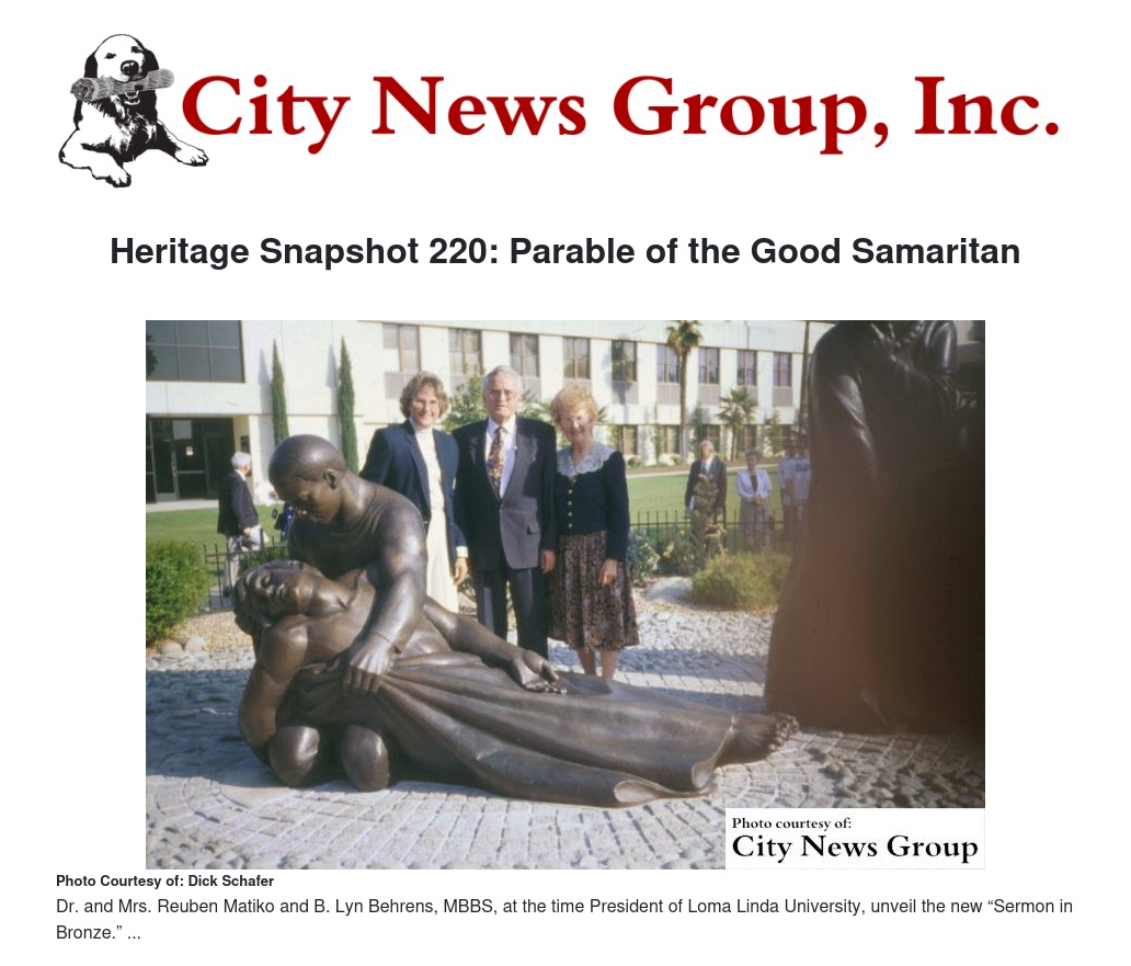 The bronze Good Samaritan sculpture was unveiled and dedicated Oct. 14, 1995. The “Sermon in Stone” is now a “Sermon in Bronze.” Both “sermons” were underwritten by Dr. and Mrs. Reuben Matiko.
