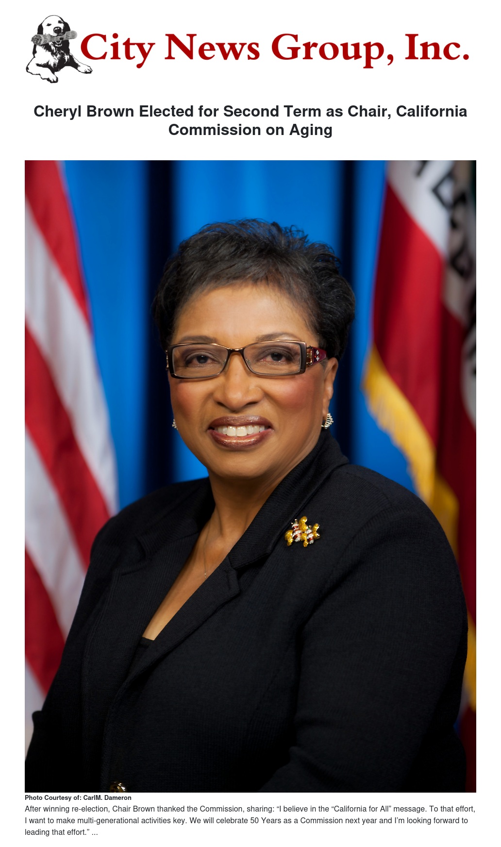 Cheryl Brown Elected for Second Term as Chair, California Commission on Aging by Carl M.Dameron - City News Group, Inc.