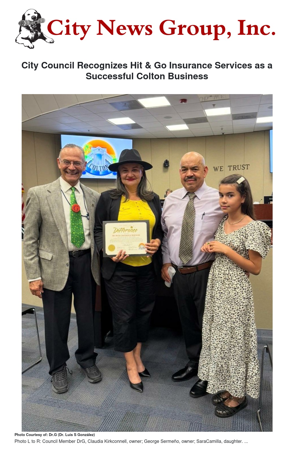 City Council Recognizes Hit & Go Insurance Services as a Successful Colton Business by Dr.G (Dr. Luis S González) - City News Group, Inc.