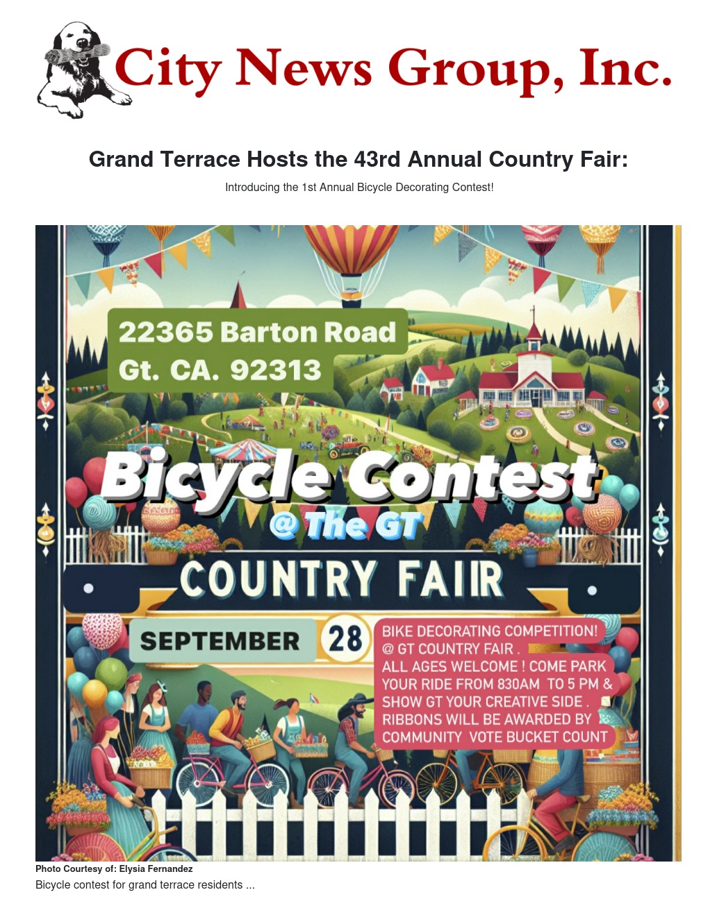 The City of Grand Terrace is excited to announce the addition of a bicycle decorating contest to its 43rd Annual Country Fair, taking place on September 28, 2024. This contest is open to all ages and will be held on-site during the fair, with no entry fee required.
