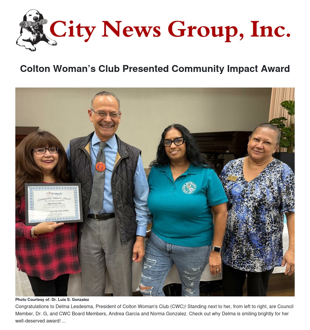 The CITY TALK “Community Impact Award” was established in 2019 to recognize the great efforts that groups and individuals make “behind the scenes” to make our community, the City of Colton, a better place. The Colton Woman’s Club is an excellent choice for this recognition, and truly represents the very best, in terms of recognizing positive contributions to the community of Colton, which is the purpose of this award. Congratulations to President Delma Lesdesma, the Board, and all the members of the Colton Woman’s Club for their dedication, hard work, and contributions.
