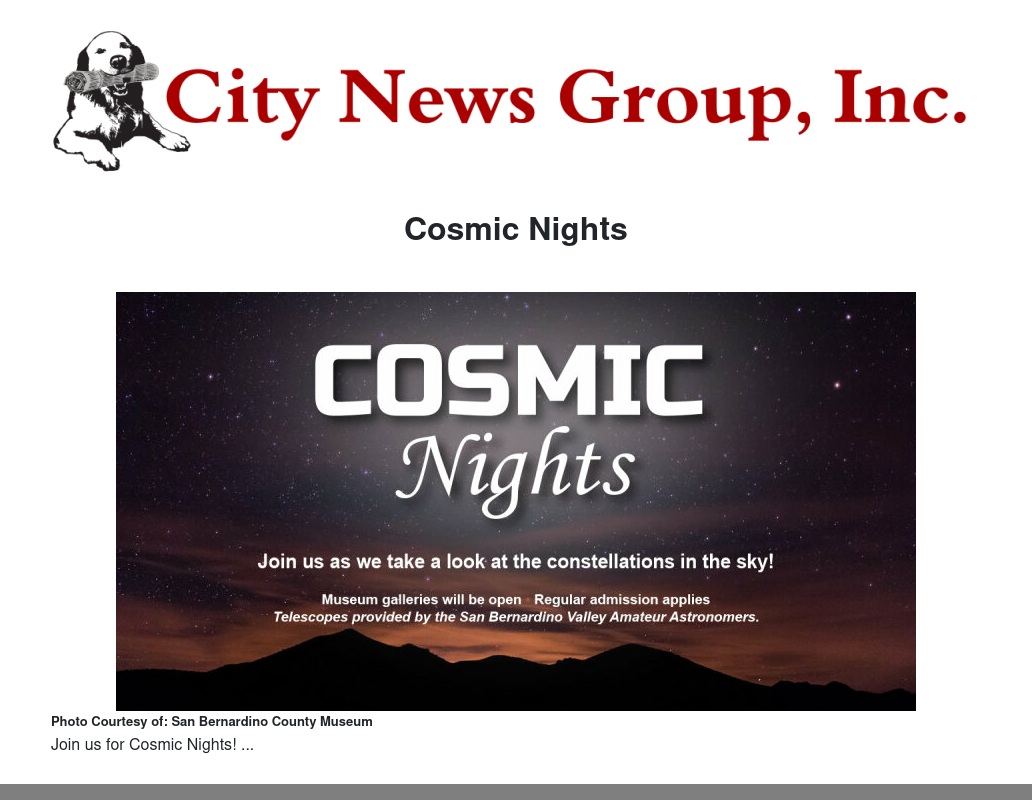 Join us Friday, March 15 2024 for Cosmic Nights! In partnership with, the San Bernardino Valley Amateur Astronomers (SBVAA). The event takes place at the San Bernardino County Museum 2024 Orange Tree Lane Redlands, CA 92374 outdoors, weather permitting, and guests are advised to wear comfortable clothing and shoes. Museum galleries will be open during the event. General admission is $10 (adult), $8 (military or senior), $7 (student), and $5 (child ages 6 to 12). Children five and under are free. Museum Association members receive a 50% discount on admission. Parking is free. The museum is accessible to persons with disabilities. The partnership helps SBVAA, founded in 1958, achieve their goal of introducing the community to astronomy, to organize amateur astronomers in the San Bernardino Valley area, and to increase knowledge and excitement in astronomy.