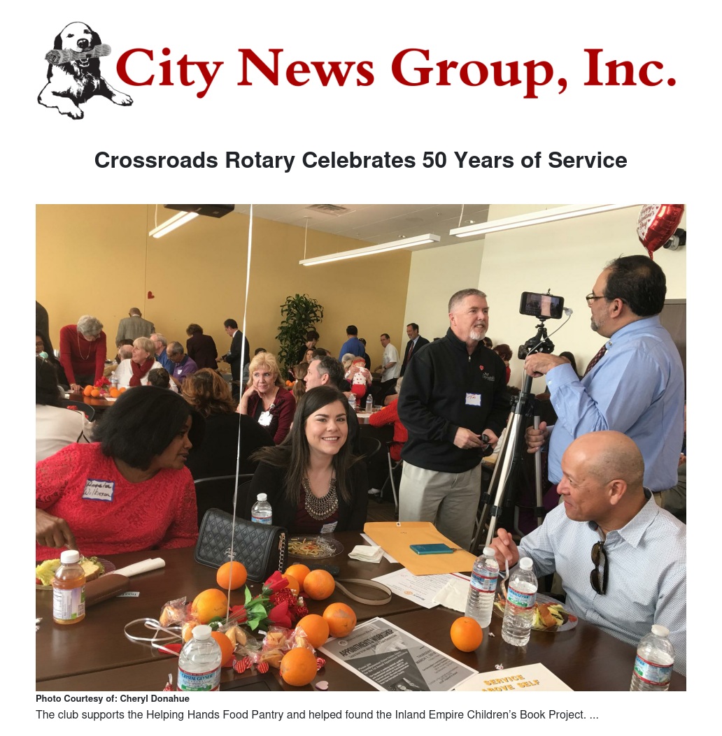 Crossroads Rotary meets Wednesdays at 12 noon at 250 S. G Street, San Bernardino. For information, visit crossroadsrotary.net or contact President Gary Kerstetter, 909-253-3154 or gary.kerstetter@yahoo.com.
