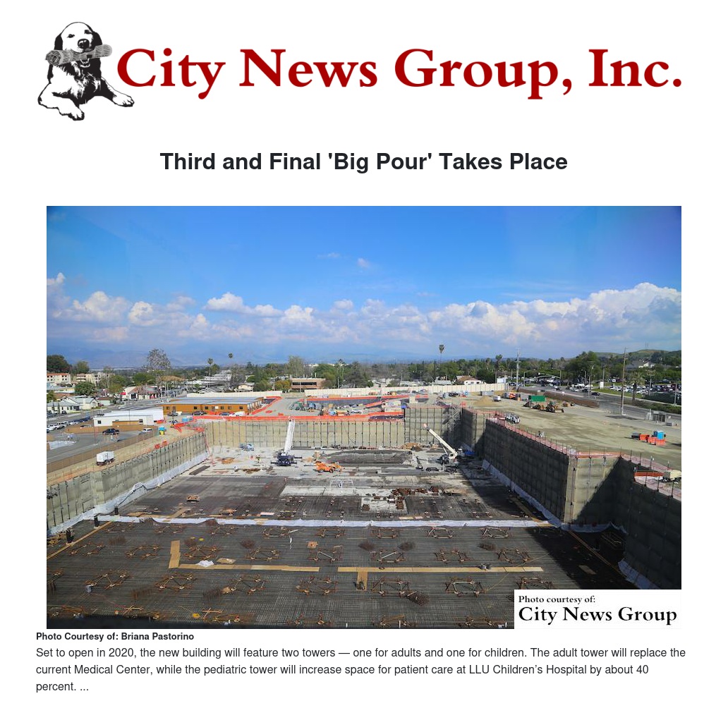 LOMA LINDA>> This past weekend marked the completion of a major milestone in the construction of the new hospital at Loma Linda University Health. Over 5,000 yards of concrete were brought in for the third and final time during a 10-hour overnight workathon.