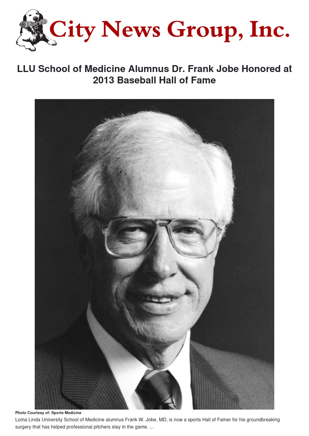 LLU School of Medicine Alumnus Dr. Frank Jobe Honored at 2013 Baseball Hall of Fame