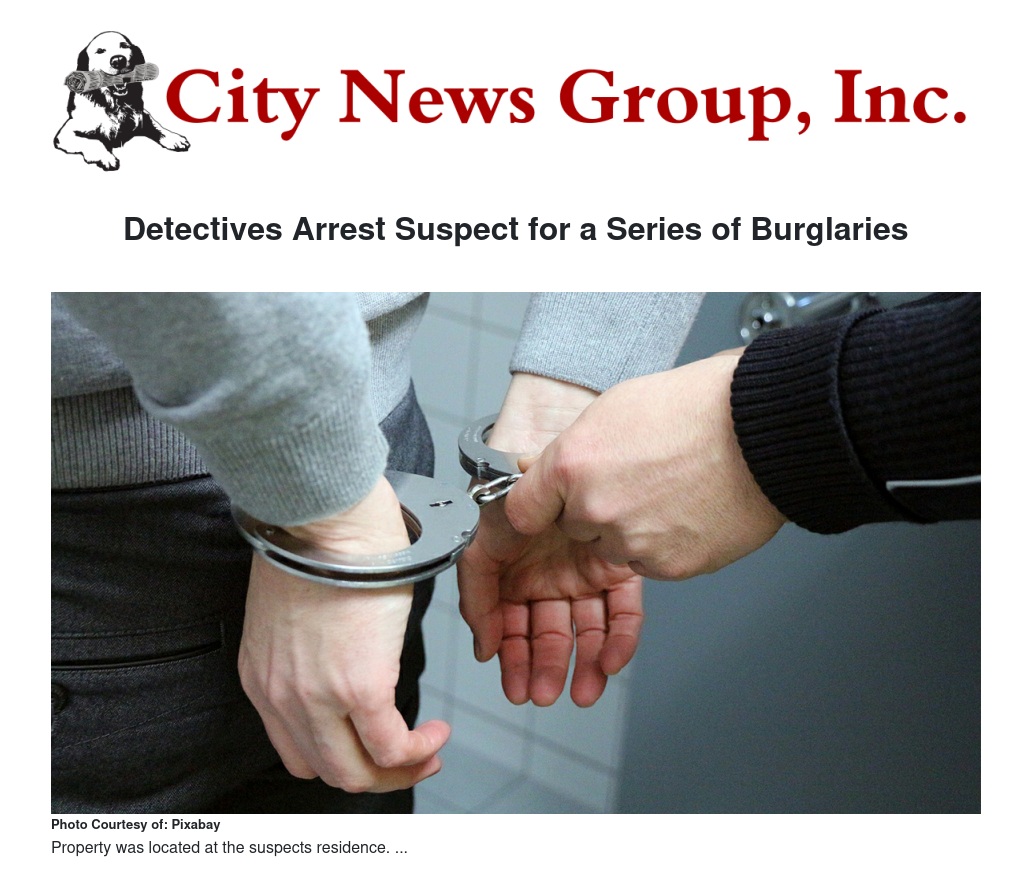 The arrest is a culmination of an investigation into a series of burglaries that have occurred over several months. The owner of a Loma Linda business positively identified a large amount of stolen property that was recovered from the suspect's residence after a search was conducted. The suspect was not at home during the search and reportedly fled to another county.