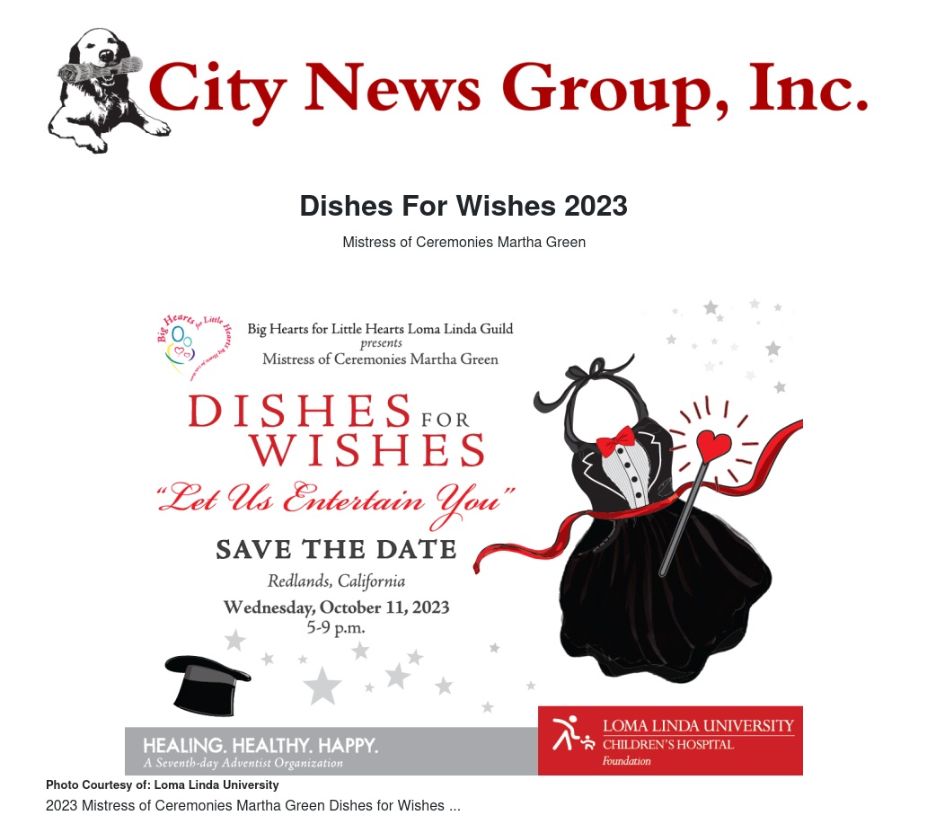 The Big Hearts for Little Hearts Loma Linda Guild’s Dishes for Wishes: “Let Us Entertain You” event on Wednesday, October 11, 2023, at the Loma Linda Korean Seventh-day Adventist Church on New Jersey Street in Redlands, is set to be a fantastic gathering. The event will feature Martha Green as the Mistress of Ceremonies and aims to raise funds for Loma Linda University Children’s Hospital. There will be plenty of food to enjoy and various vendors offering clothing, purses, chocolates, handcrafted items, and housewares. An opportunity drawing and live auction are planned as well.