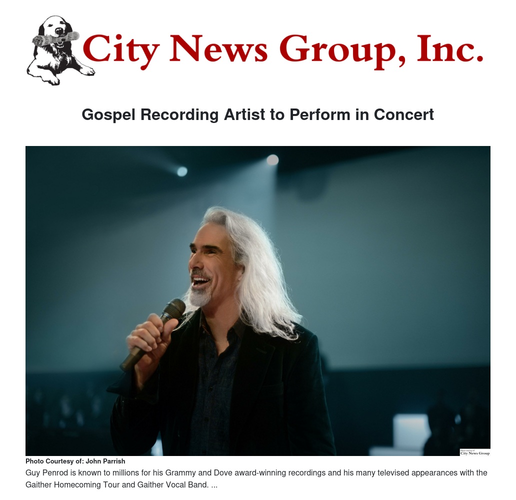 Visually striking for his flowing white hair, Penrod left the Gaither vocal organizations to launch his successful solo ministry in 2010. His 2012 recording, “Hymns,” became that year’s top-selling southern gospel album, and this year’s January release, “Guy Penrod Live,” opened in the number two position on Nielsen’s contemporary Christian music chart. His first solo DVD, “Live Hymns and Worship,” was also released this year and debuted at number one in Billboard’s chart for music videos.