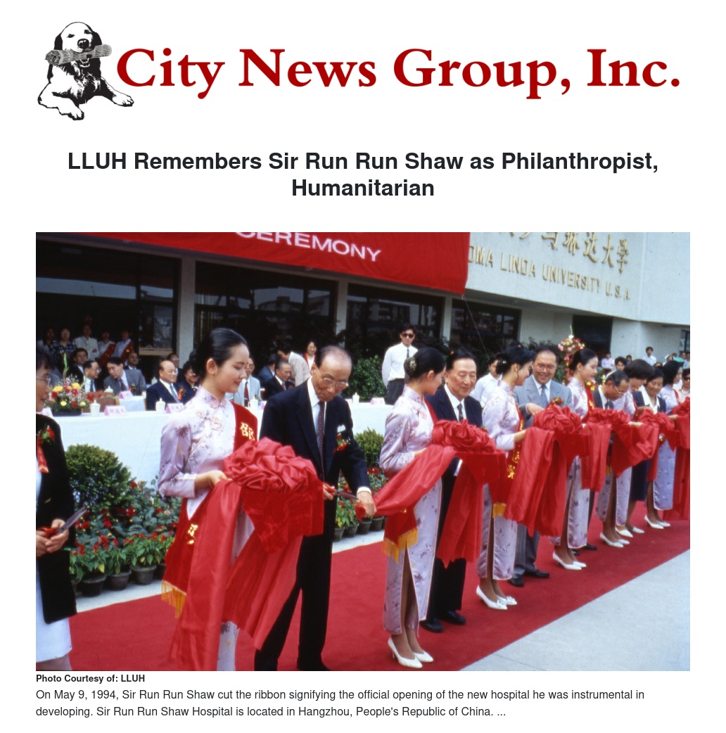 Most of the world may remember Sir Run Run Shaw as a media mogul or the man who brought Kung Fu to the big screen. Loma Linda University Health (LLUH), however, remembers him in his passing as a philanthropist and humanitarian in the world of health care. It is because of his benevolence that Sir Run Run Shaw Hospital was opened in 1994 in in the Zhejiang Province in the People's Republic of China, which transformed the delivery of health care in what was then a very poor community.