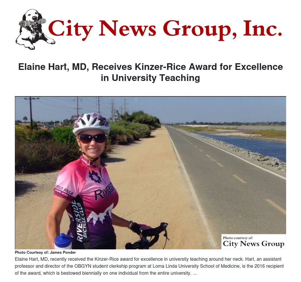 LOMA LINDA >> Elaine Hart, MD, assistant professor and director of the OBGYN student clerkship program at Loma Linda University School of Medicine (LLUSM), received the 2016 Kinzer-Rice award for excellence in university teaching during an evening ceremony on Thursday, February 4 in the Centennial Complex.
