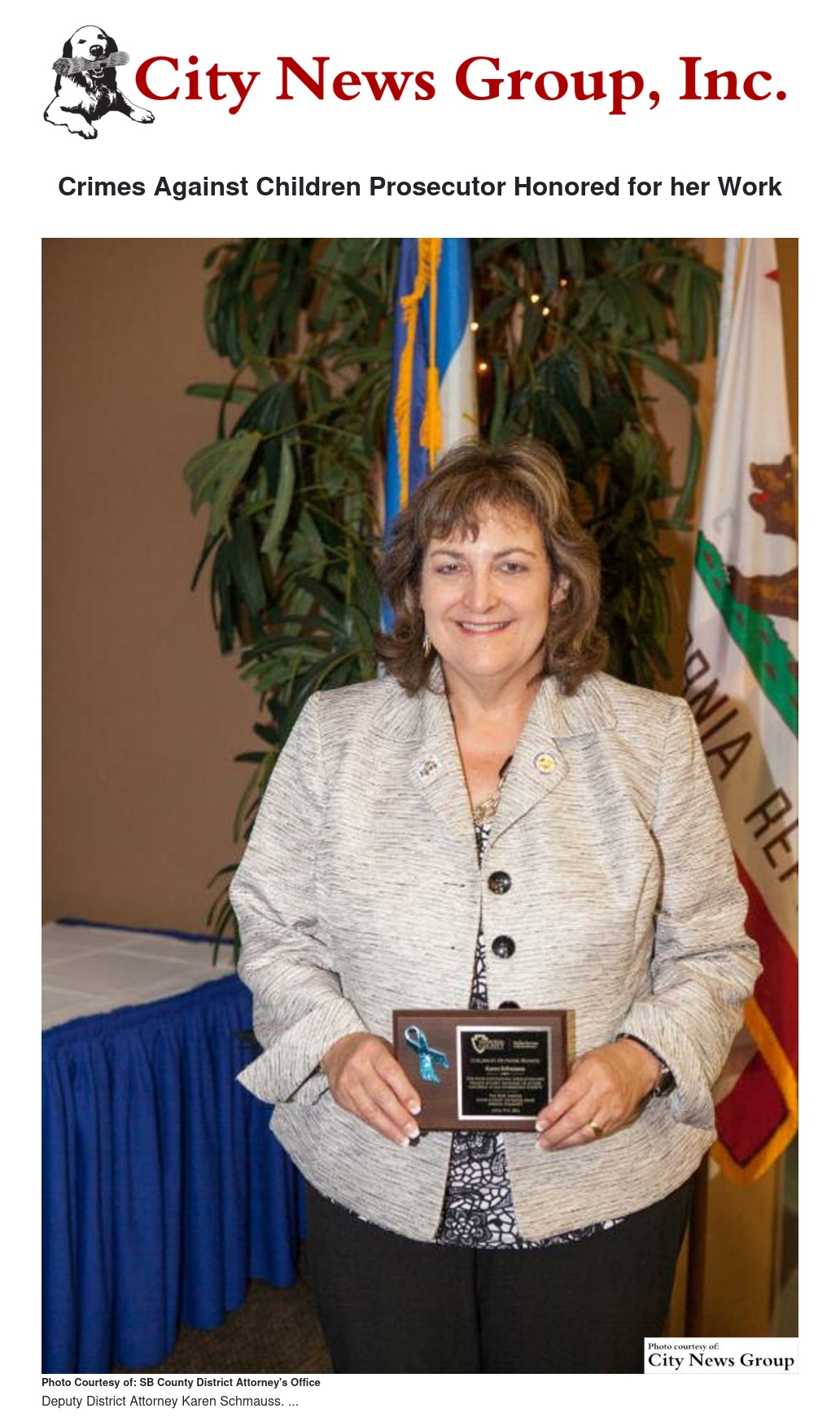 Deputy District Attorney Karen Schmauss was recently recognized at the 18th Annual "Shine a Light" on Child Abuse Awards Breakfast for her dedication and commitment as a Crimes Against Children prosecutor.