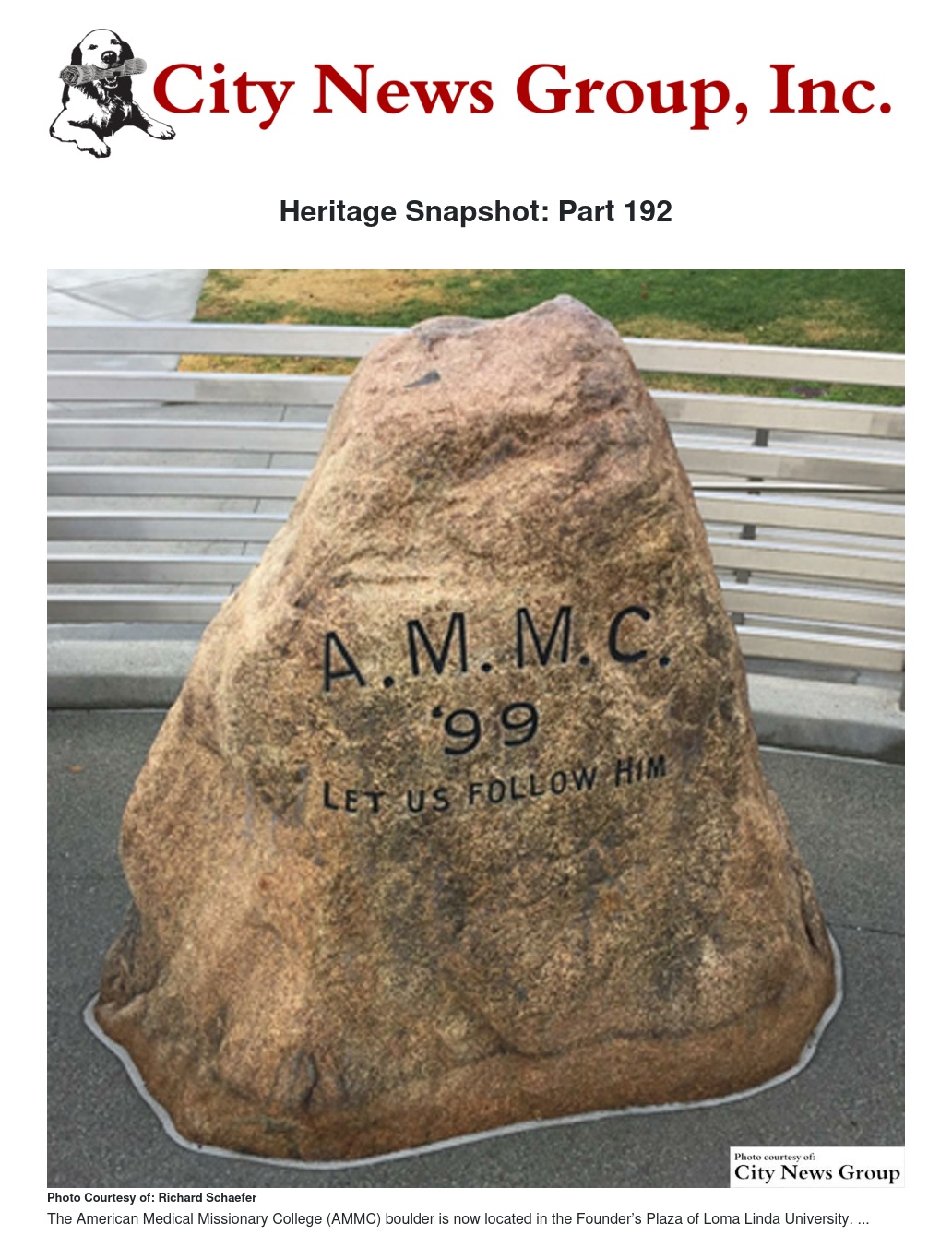 Mr. Andersen trucked the AMMC Stone to Loma Linda with the help of Mr. A. Z. Morrison and his young son. A relocation and unveiling ceremony for the old waymark was held on June 5, 1955. Dean Walter E. Macpherson introduced the honored speaker, Dr. James W. Erkenbeck of San Diego, one of 10 living members of the AMMC Class of 1899.