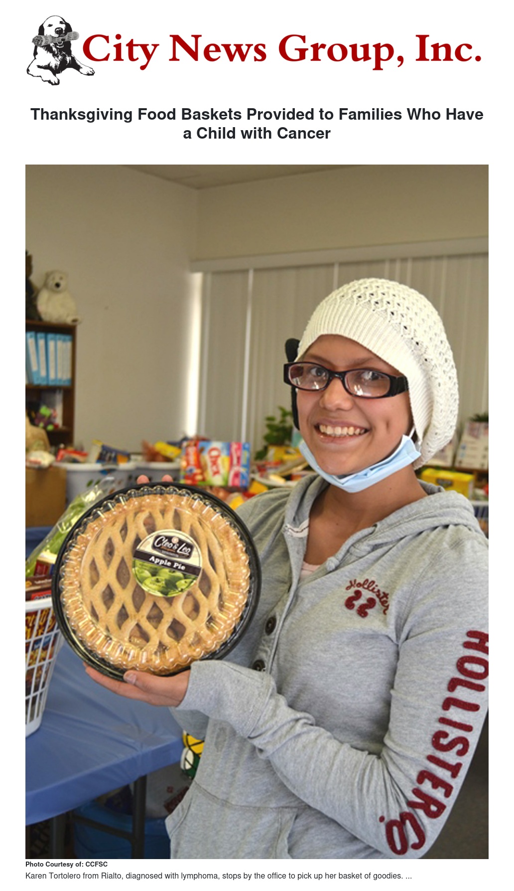 The Childhood Cancer Foundation of Southern California (CCFSC) distributed over 80 Thanksgiving food baskets with all the fixings for a complete Thanksgiving dinner and over a week’s worth of food to families who have a child with cancer. The baskets were put together by various generous donors and delivered Tuesday morning to the Childhood Cancer Foundation office to then be picked up by families.
