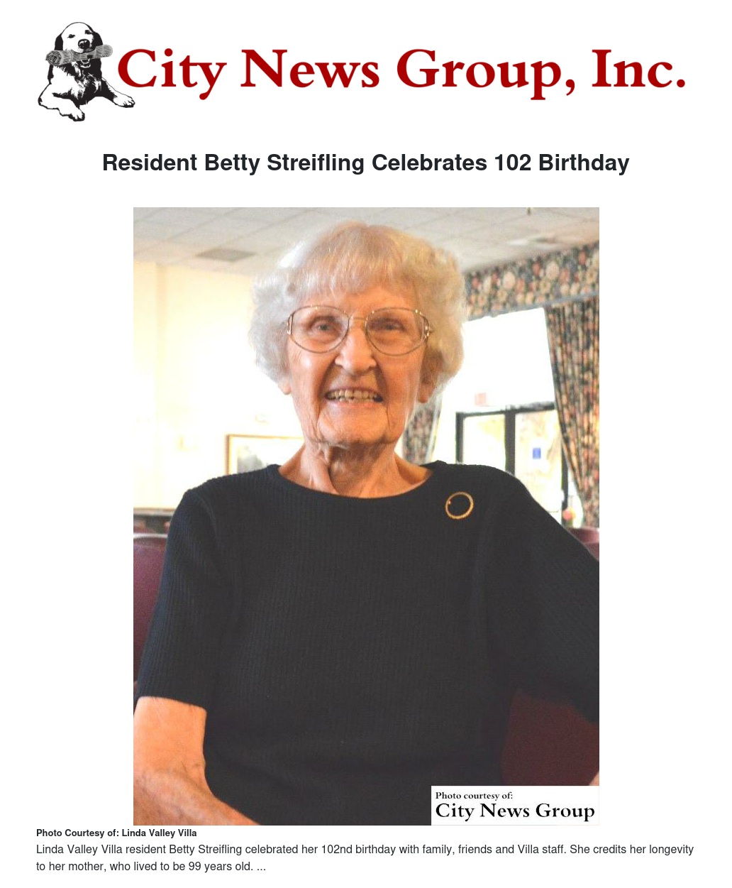 Linda Valley Villa resident Betty Streifling celebrated 102 years of life on Friday, Aug. 28 with family, friends and staff at Linda Valley Villa to celebrate the momentous occasion.