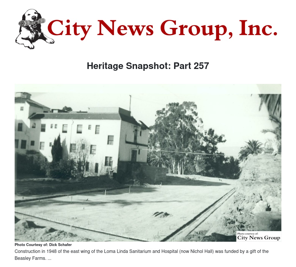 The remaining property increased in value over the years until 1955, when CME sold it for nearly $900,000. President Godfrey T. Anderson lauded the Beasley’s and acknowledged their gift: “It comes at a time when the current $6,000,000 expansion program on the College of Medical Evangelists campuses can be best used. The gift exemplifies the willingness of private citizens to identify themselves with the need of education to the extent of giving. The fact that Mr. and Mrs. Beasley gave this property to the cause of education is a tribute to their minds and hearts.”