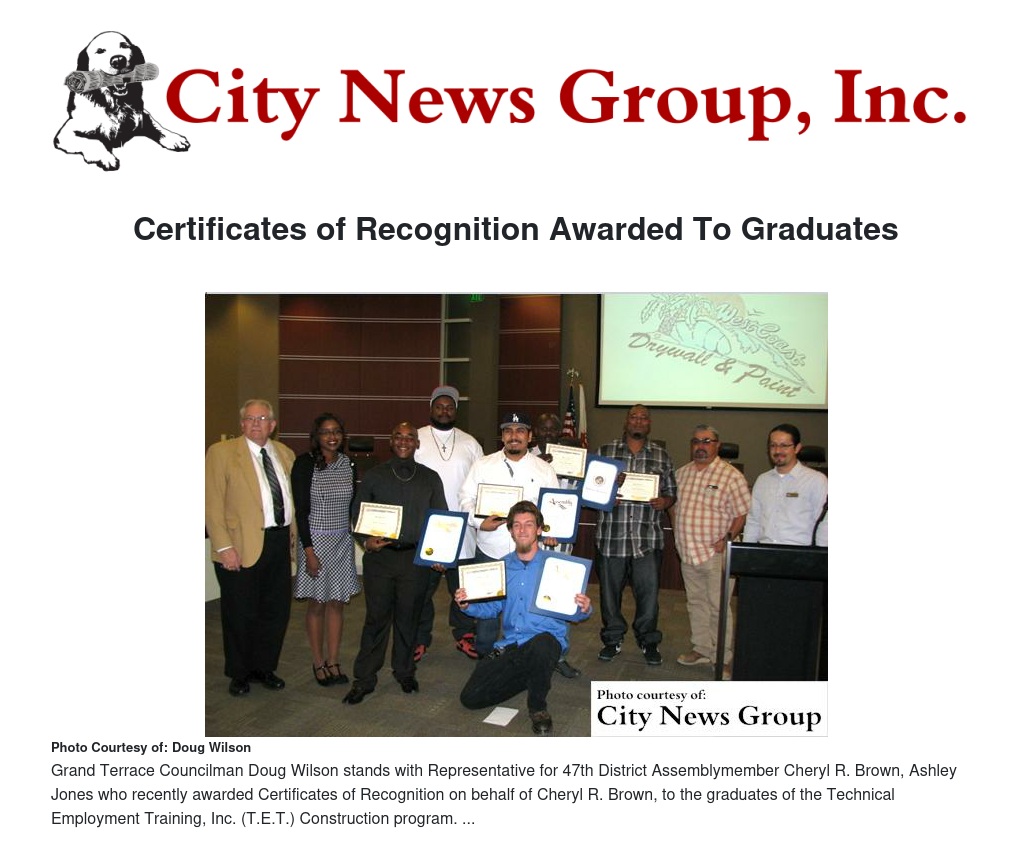 Representative for 47th District Assemblymember Cheryl R. Brown, Ashley Jones, awarded Certificates of Recognition to the graduates of the Technical Employment Training, Inc. (T.E.T.) Construction program on Wednesday, Feb. 10 at the Inland Valley Development Agency Board Room.
