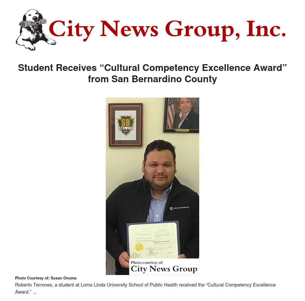 LOMA LINDA>> Roberto Terrones, a student at Loma Linda University School of Public Health, received the “Cultural Competency Excellence Award” from the Office of Cultural Competence and Ethnic Services, Department of Behavioral Health, San Bernardino County.