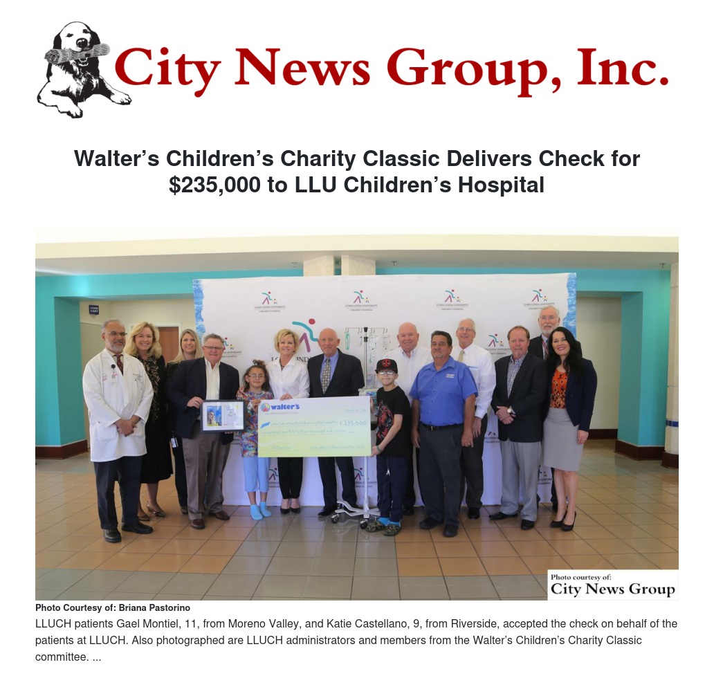 LOMA LINDA >> Walter’s Children’s Charity Classic (WCCC) celebrated 20 years of giving to Loma Linda University Children’s Hospital (LLUCH) by presenting the hospital with a check for $235,000 on Wednesday, March 23. The funds will go toward Vision 2020 and the construction of a new hospital tower dedicated to pediatrics.