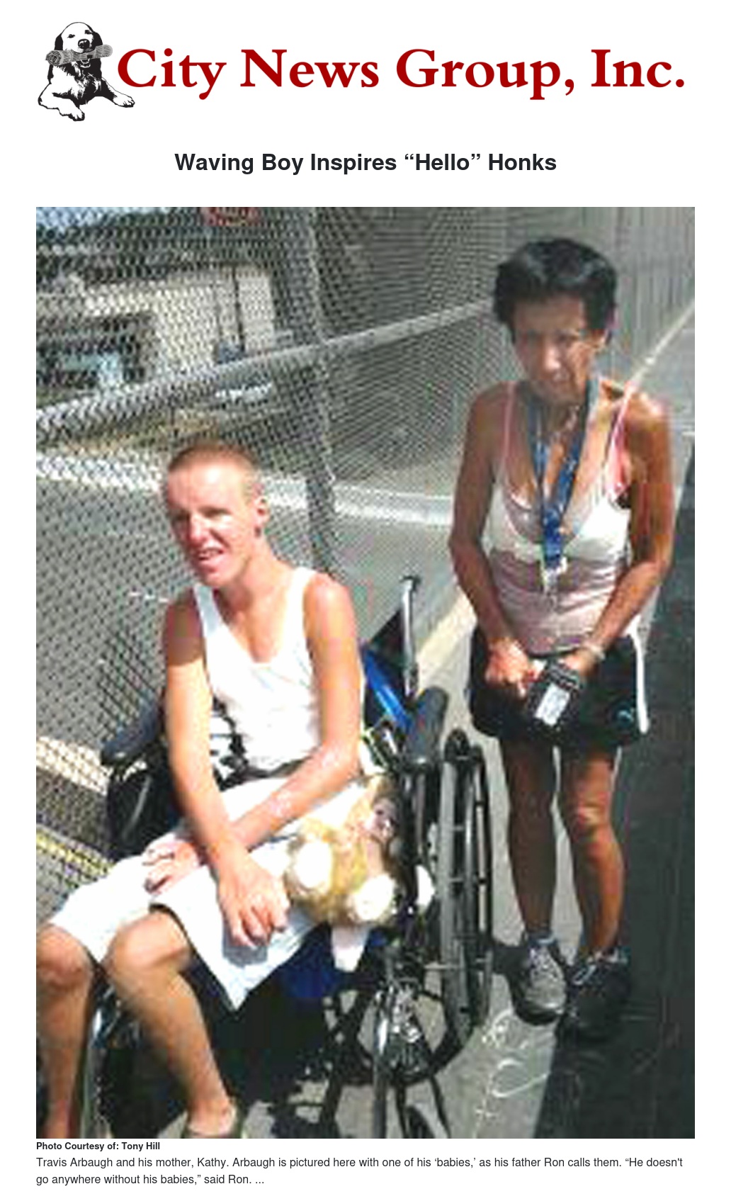 On any given weekday around lunchtime Arbaugh, 18, and his mother, Kathy, can be found sitting on the bridge overlooking the freeway, where Arbaugh waves his hands joyously and passing cars and big rigs honk back. He’s become something of a local celebrity, often being stopped by passers-by.