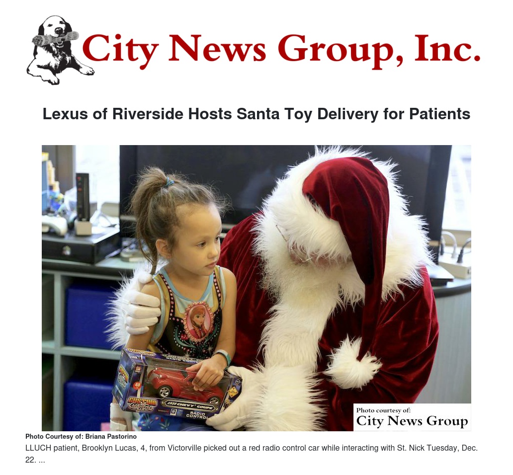 Patients at Loma Linda University Children’s Hospital (LLUCH) got an early Christmas delivery, courtesy of Lexus of Riverside. The luxury car dealer hosted the first ever Santa Toy Delivery on Tuesday, Dec. 22 delivering 100 toys to patients receiving care at the hospital.