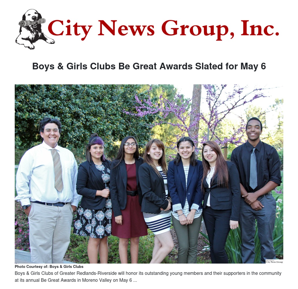 Boys & Girls Clubs of Greater Redlands-Riverside will honor its outstanding young members and their supporters in the community at its annual Be Great Awards in Moreno Valley on May 6.