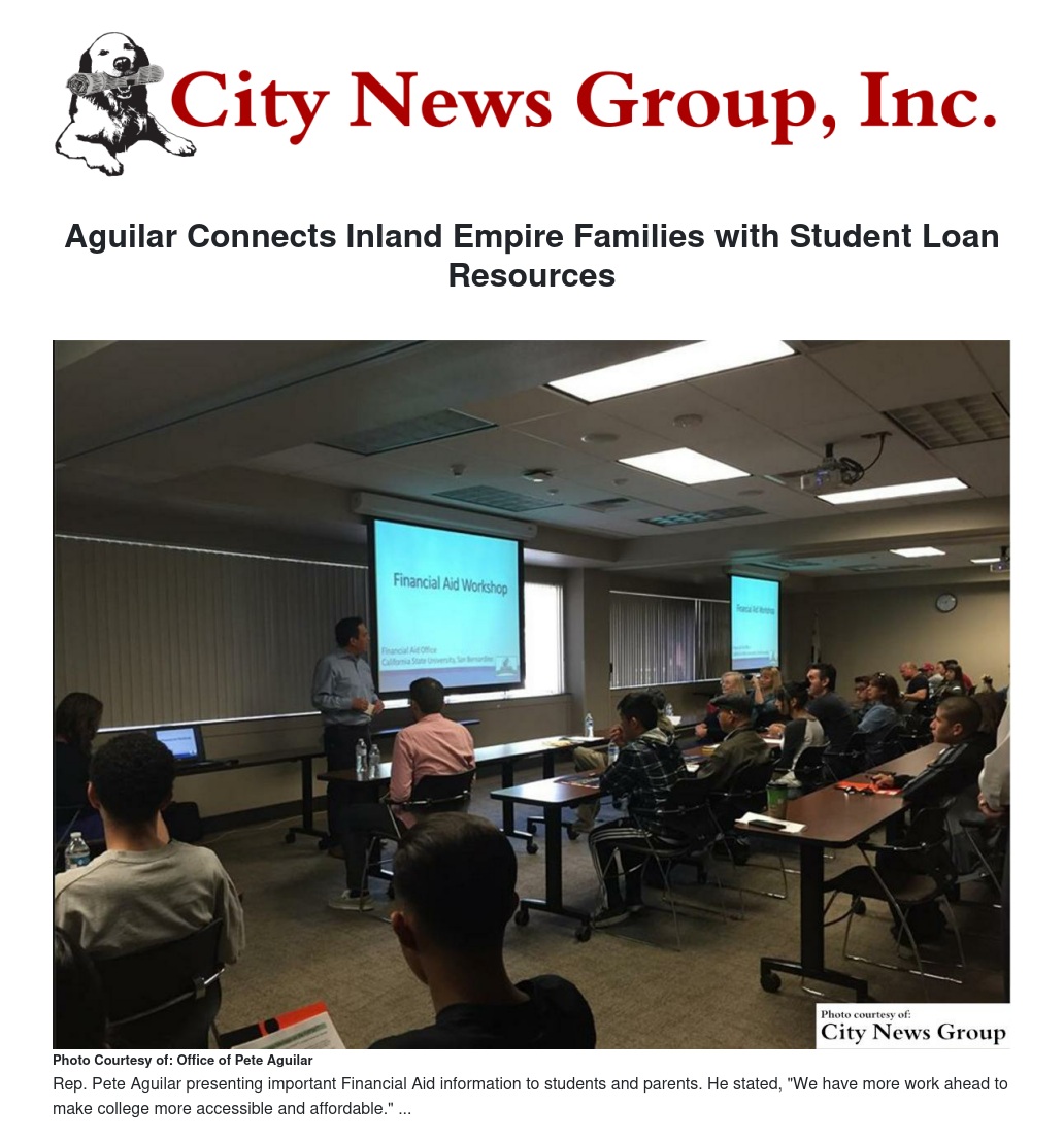 Rep. Pete Aguilar (D-San Bernardino) recently connected Inland Empire families with critical student loan resources at his FAFSA (Free Application for Federal Student Aid) and student loan workshop.
