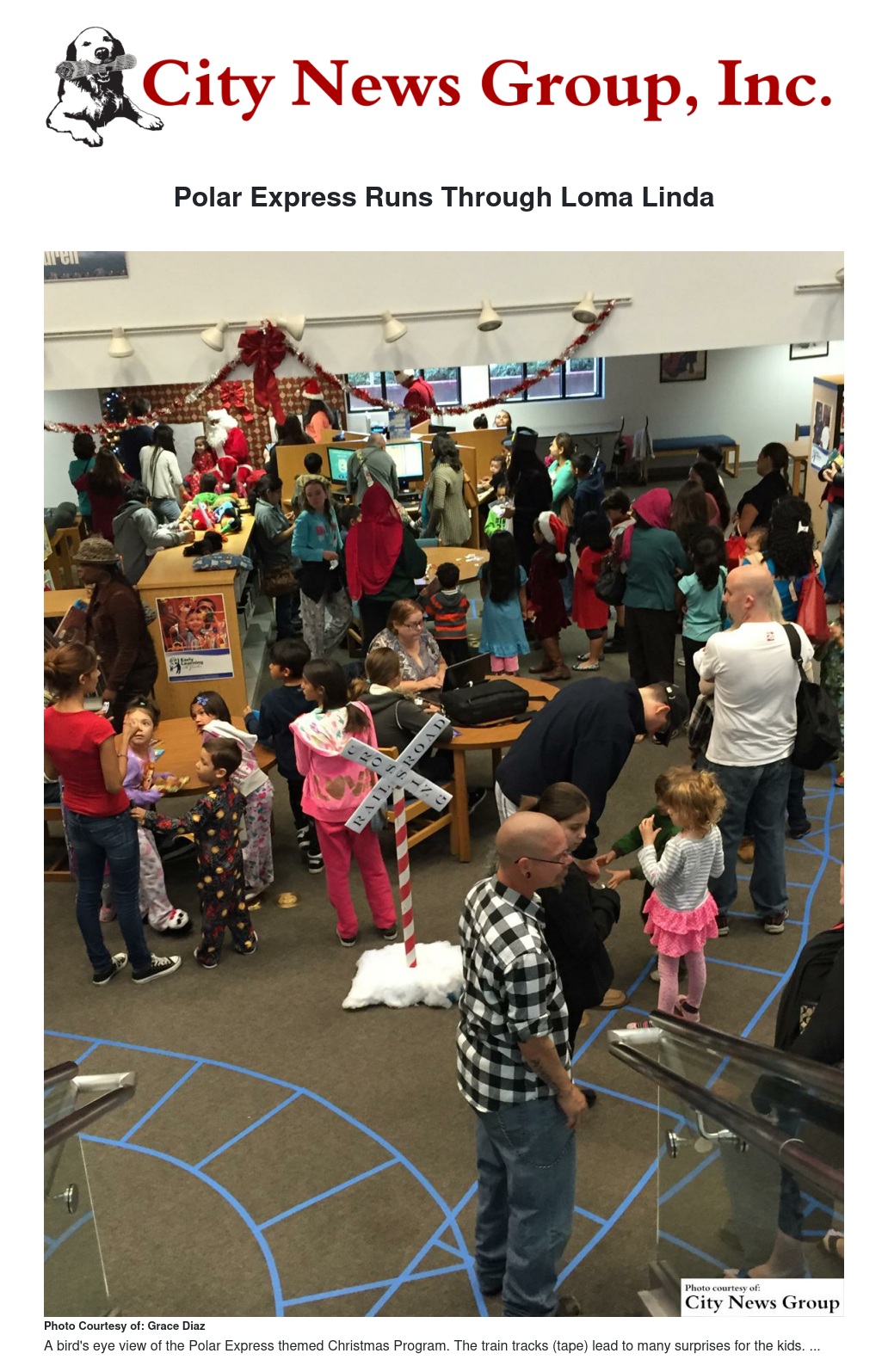 Santa Claus boarded the Polar Express to the Loma Linda Branch Library for a Christmas-themed program on Sunday, Dec. 14. Santa’s busy schedule included greeting children, eating cookies, and taking notes on what the kids who came to visit him wanted to see under their Christmas tree this year.