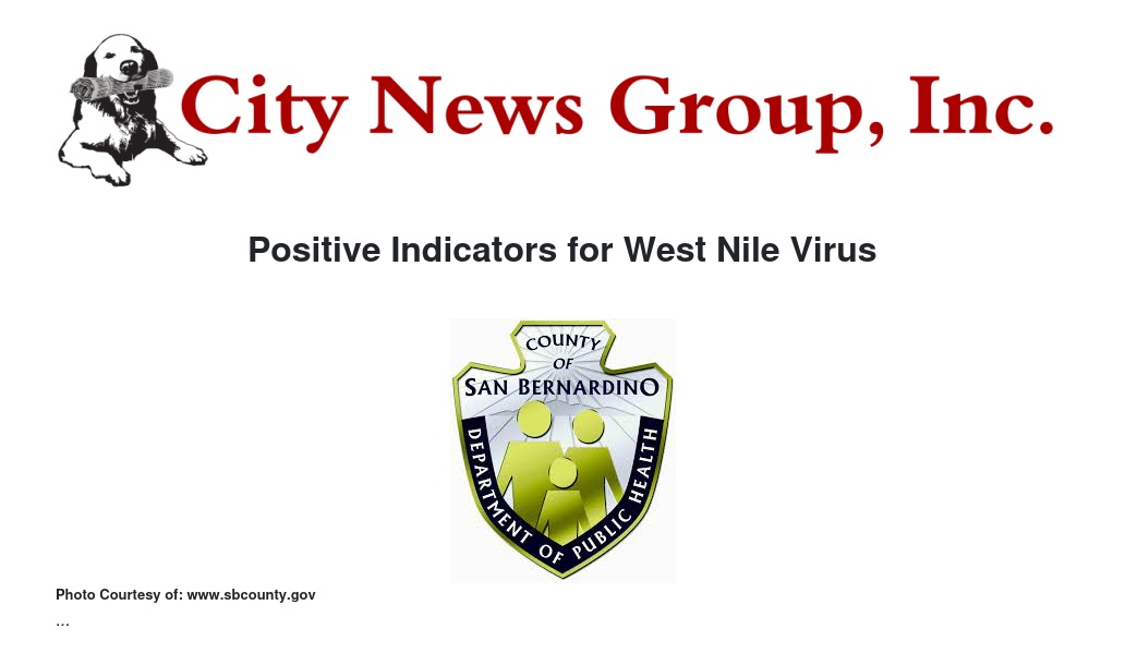 The Division of Environmental Health Service’s Mosquito and Vector Control Program (MVCP) has reported multiple positive indicators for West Nile Virus (WNV) throughout San Bernardino County.
