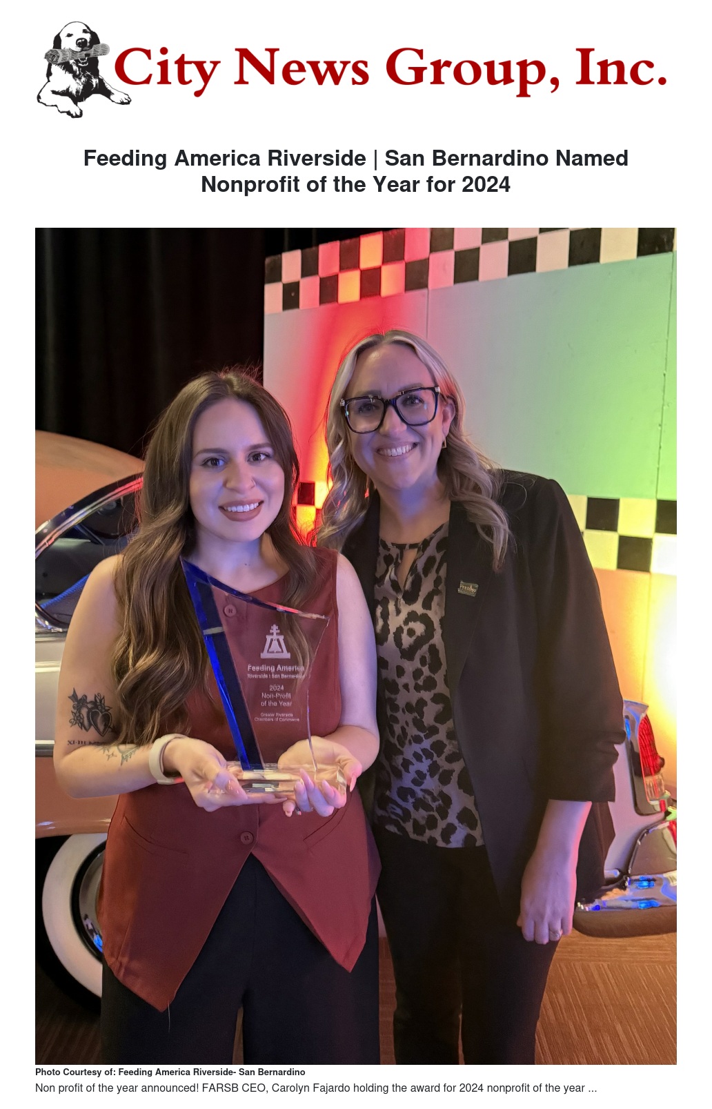 Feeding America Riverside | San Bernardino (FARSB) has been named the Greater Riverside Chambers of Commerce's Nonprofit of the Year for 2024 for their vital hunger-relief programs and alleviation of food insecurity in the City of Riverside and beyond. FARSB and other awardees were honored at the Chamber’s Inaugural Celebration, an annual recognition dinner held on Thursday, March 20th, 2025 at the Riverside Convention Center.