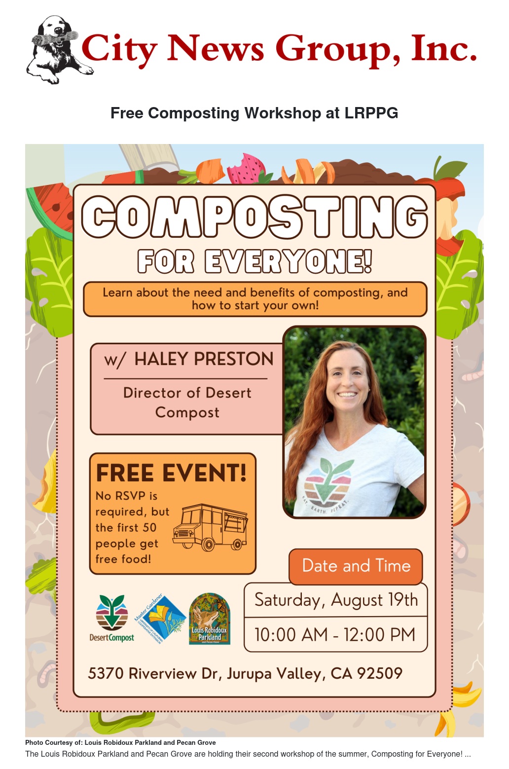 Would you like to learn how to reduce waste while promoting healthy soils and communities? Join Desert Compost for a free presentation this weekend at the Louis Robidoux Parkland & Pecan Grove. The workshop will be held on Saturday, August 19, from 10 AM to 12 PM at 5370 Riverview Drive in Jurupa Valley.