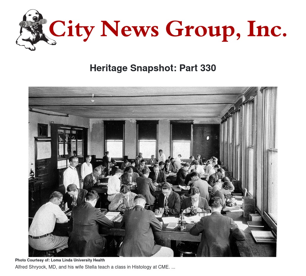 Dr. George K. Abbott, president of both the Sanitarium and College, remembered that Alfred had had some experience teaching at AMMC and urged him to "come and join us." Specifically, he wanted Shryock to teach courses in histology (microscopic anatomy) and human embryology. Dr. Shryock also worked for Dr. A. B. Olson at AMMC as a student laboratory assistant for a course in histology.