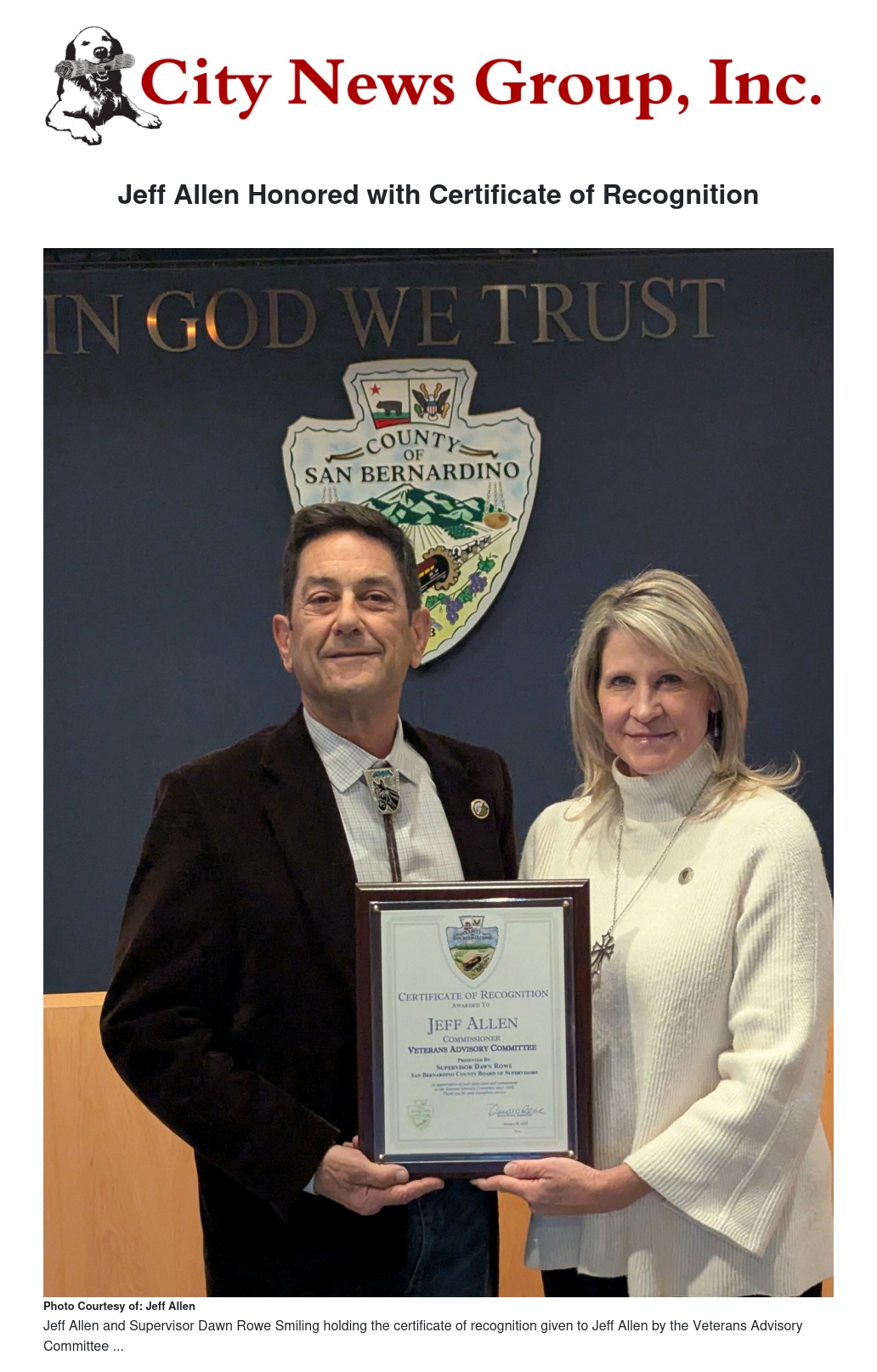 Jeff Allen was recently awarded a Certificate of Recognition for his outstanding service in the Veterans Advisory Committee. Known for his tireless dedication and impactful leadership, Allen has made a profound difference in the lives of veterans throughout the community since 2008.
