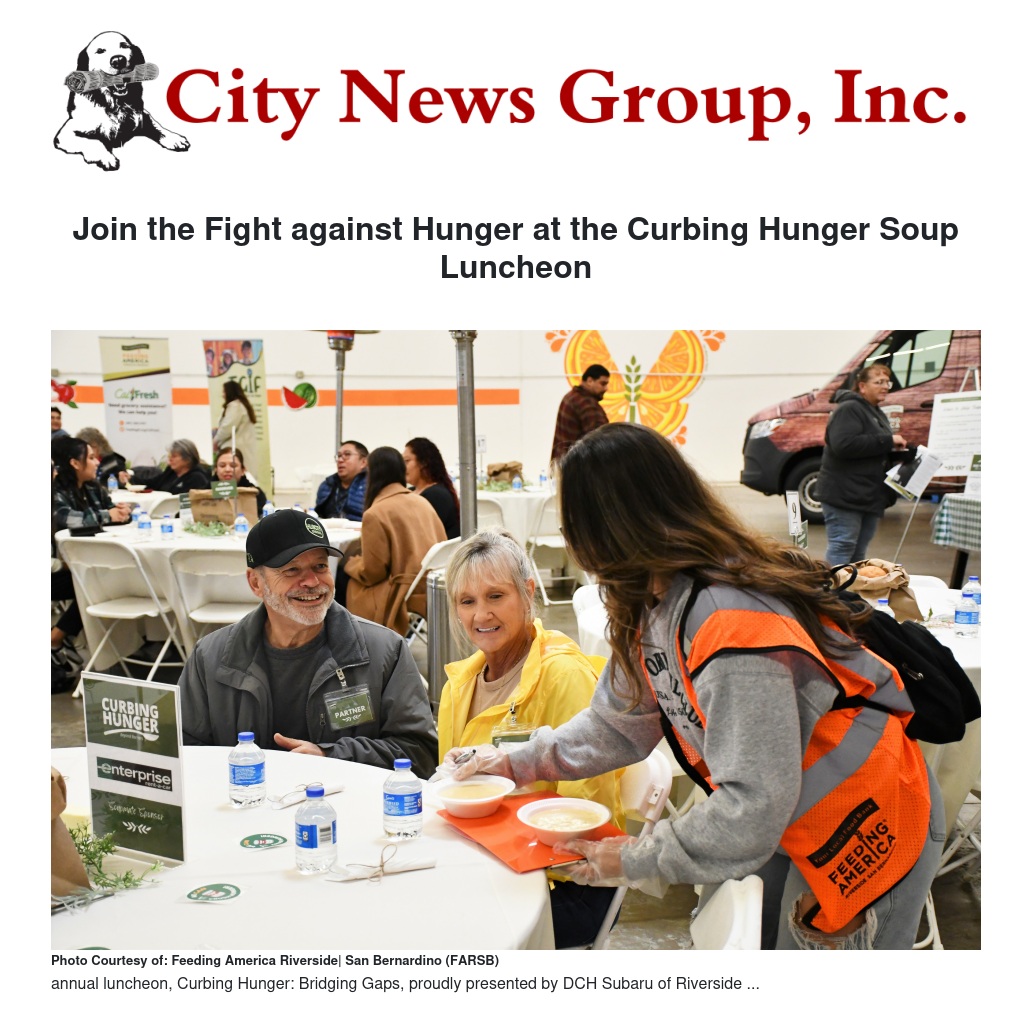 Feeding America Riverside | San Bernardino (FARSB) invites you to its highly anticipated annual luncheon, Curbing Hunger: Bridging Gaps, proudly presented by DCH Subaru of Riverside. Held at FARSB’s warehouse, this in-person gathering offers a meaningful experience with a humble yet heartfelt soup-and-bread meal. Attendees will discover how FARSB is driving impactful initiatives to combat food insecurity across the Inland Empire while connecting with like-minded community advocates.