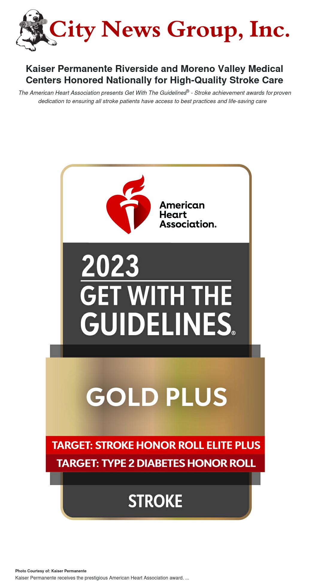 Kaiser Permanente Riverside and Moreno Valley Medical Centers have been nationally honored for their high-quality stroke care, receiving the prestigious American Heart Association’s 2023 Get With The Guidelines® - Stroke Gold Plus award with Target: Stroke? Honor Roll Elite Plus and Target: Type 2 Diabetes? Honor Roll. These awards recognize their unwavering commitment to implementing high-quality care for stroke patients, following nationally recognized guidelines and ultimately leading to improved outcomes and saved lives.