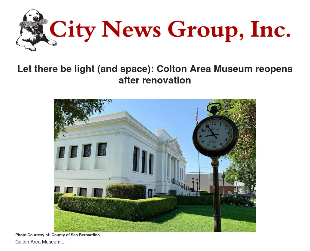 The Colton Area Museum Board President Christina Perris shared, “On behalf of the Board of the Colton Area Museum, we appreciate the tremendous amount of guidance and assistance we have received from the San Bernardino County Museum’s director and curatorial staff in helping us move forward with this monumental redesign of our exhibition space and collections area. We truly hope that this new vision of the museum speaks to a more inclusive, ever-evolving narrative history of Colton, which will grow and change as more exciting pieces of Colton’s rich past are discovered by residents and hope they will become active patrons in the museum’s bright future.”