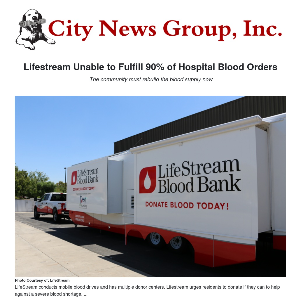 LifeStream Blood Bank, the community's blood supplier, cannot meet the needs of area hospitals. Approximately 90% of hospital Type O orders are going unfulfilled.