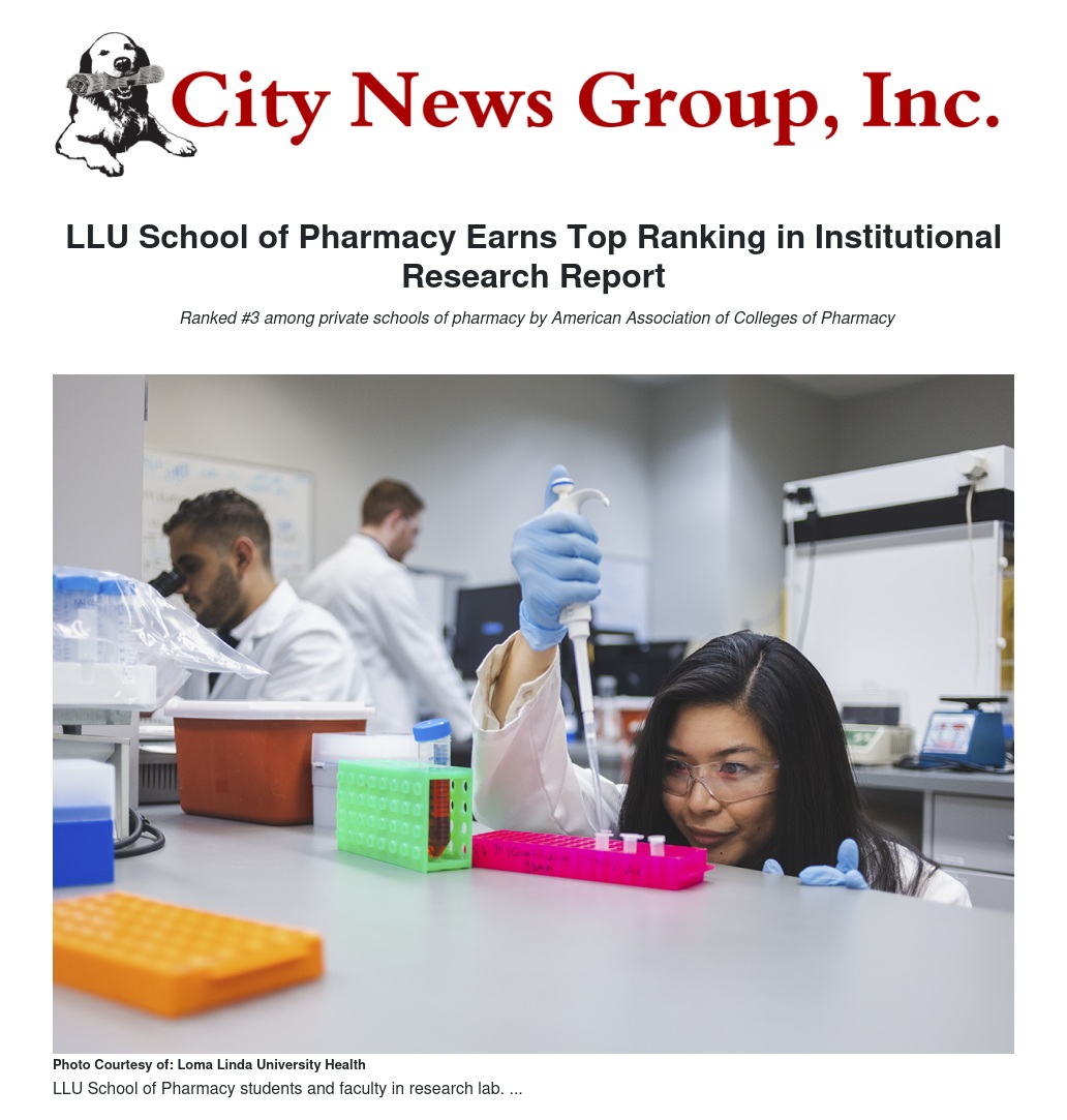 Loma Linda University School of Pharmacy received a top ten ranking from the American Association of Colleges of Pharmacy for research funding.