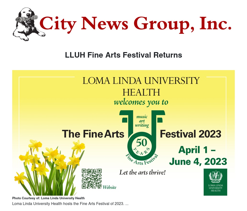 Loma Linda University Health's Fine Arts Festival for 2023 will start soon. During April and May, a variety of programs will be offered that highlight the visual arts, performing arts, and dramatic arts. Click here for a full program of events.
