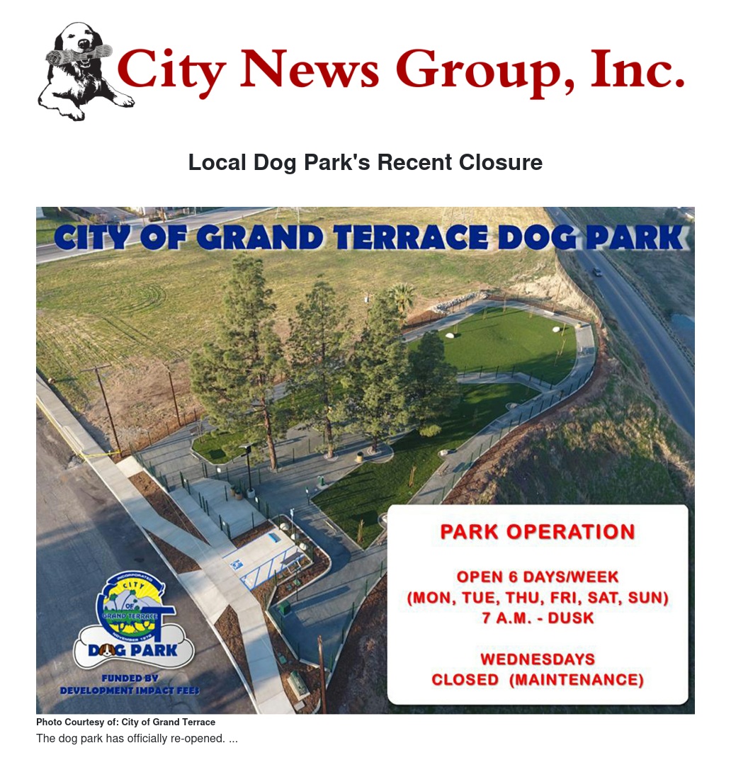 Many citizens were confused as to why the park suddenly looked empty and no dogs were running about. Soon after, the City of Grand Terrace posted an official 'closed' notice on their social media to notify the residents of the city. Some residents resorted to taking their four-legged friends to dog parks in surrounding local communities such as Redlands.