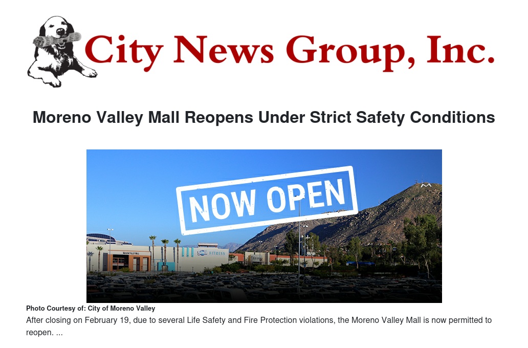 After closing on February 19, due to several Life Safety and Fire Protection violations, the Moreno Valley Mall is now permitted to reopen. Mall tenants have been allowed to reopen their businesses and invite employees to return to work to serve Mall shoppers.