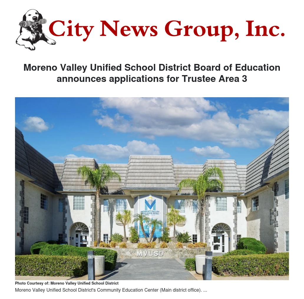 Moreno Valley Unified School District Board of Education announces applications for Trustee Area 3 by Anahi Velasco - City News Group, Inc.