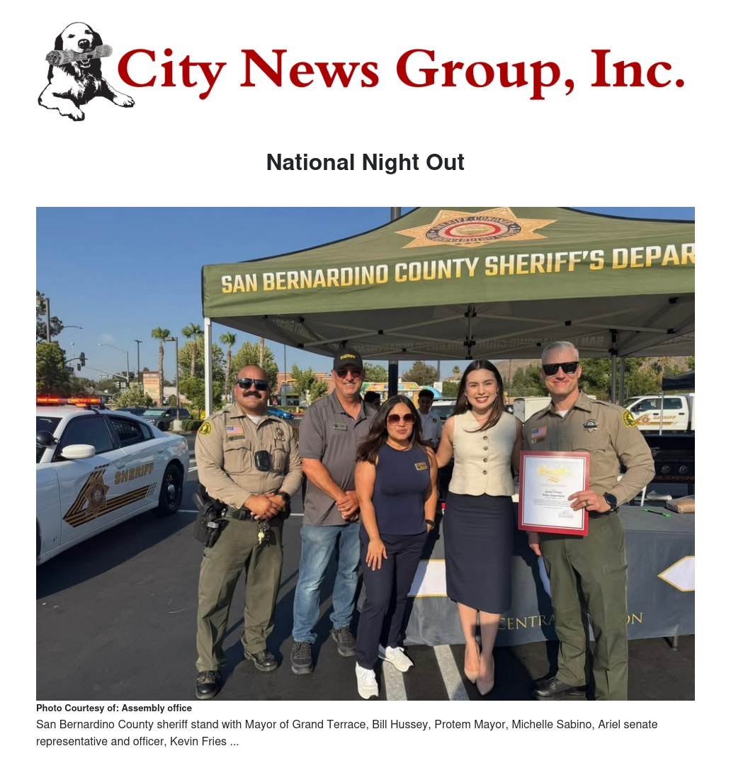 The spirit of community and gratitude was alive and well this weekend in Grand Terrace as families, neighbors, and local leaders gathered for the annual National Night Out—a cherished event that celebrates unity, safety, and the partnerships that make our neighborhoods strong.