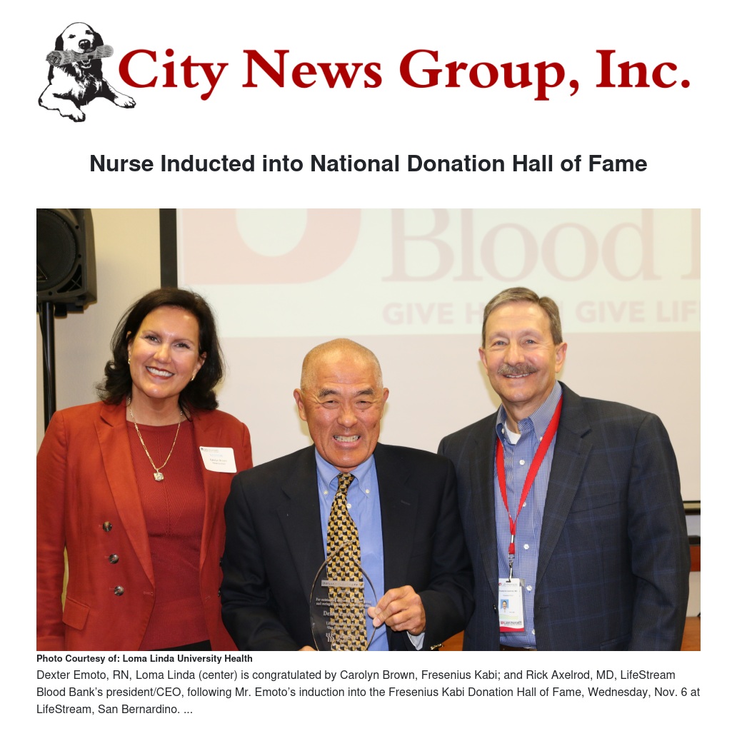Dexter Emoto, RN, a post-anesthesia care unit and recovery room nurse at Loma Linda University Health, has been inducted into the national Fresenius Kabi Donation Hall of Fame for his blood donations.