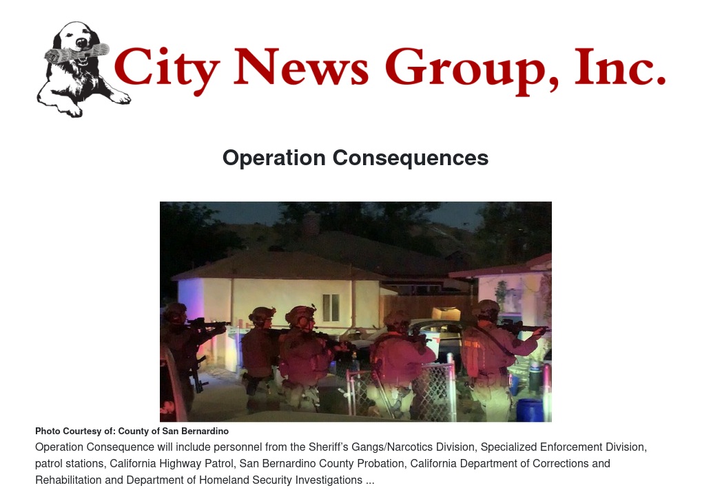 Operation Consequences will focus on conducting targeted crime suppression operations in the High Desert and the Sheriff’s jurisdiction surrounding the city of San Bernardino. The operation will include personnel from the Sheriff’s Gangs/Narcotics Division, Specialized Enforcement Division, patrol stations, California Highway Patrol, San Bernardino County Probation, California Department of Corrections and Rehabilitation and Department of Homeland Security Investigations. Operation Consequences will take place over the next several months to curb violent crime, disrupt and dismantle targeted criminal street gangs, and locate and arrest criminals who are illegally possessing, manufacturing and trafficking firearms.