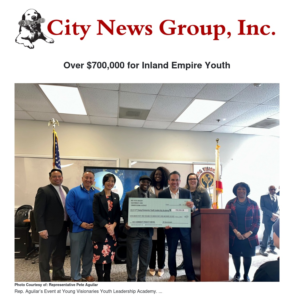 In January,  Rep. Pete Aguilar presented Young Visionaries Youth Leadership Academy with $733,533.26 in federal funding he secured for their Empowering Youth Resilience and Promoting Social Emotional Healing program. This funding will ensure Inland Empire youth have access to the tools they need to have brighter futures.
