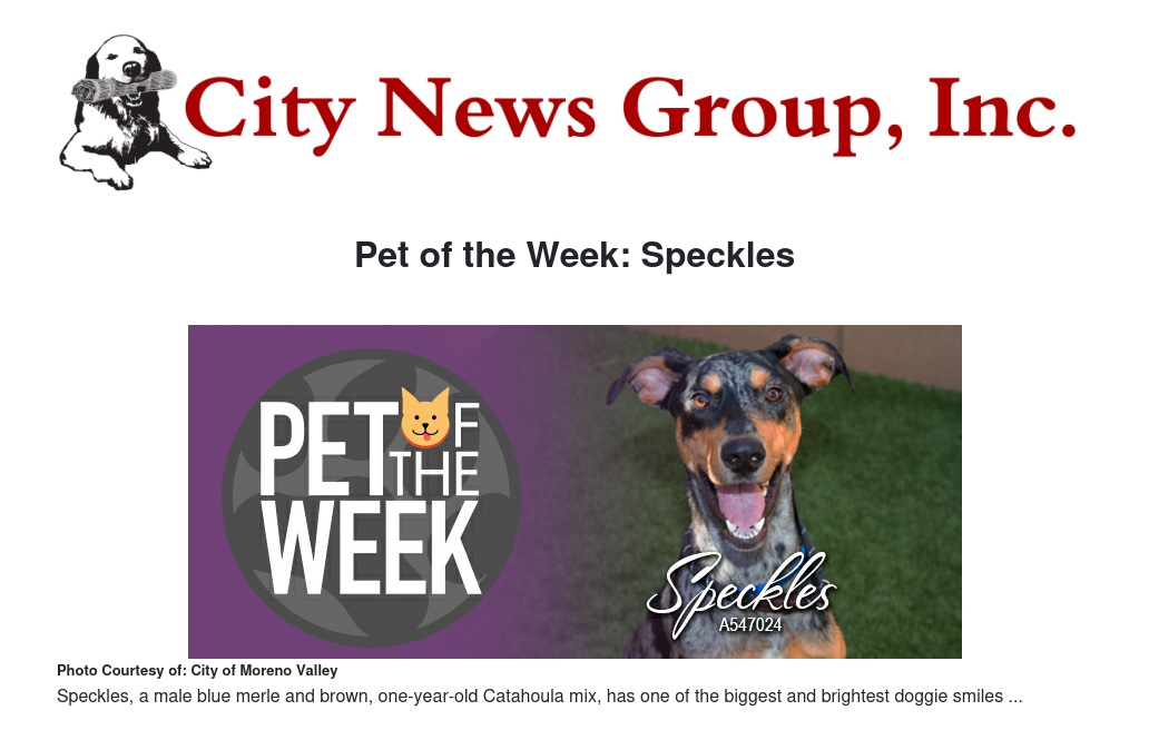 If you would like to make Speckles or any pet from the Moreno Valley Animal Shelter part of your family, please call 951.413.3790 or visit moval.org/pets.