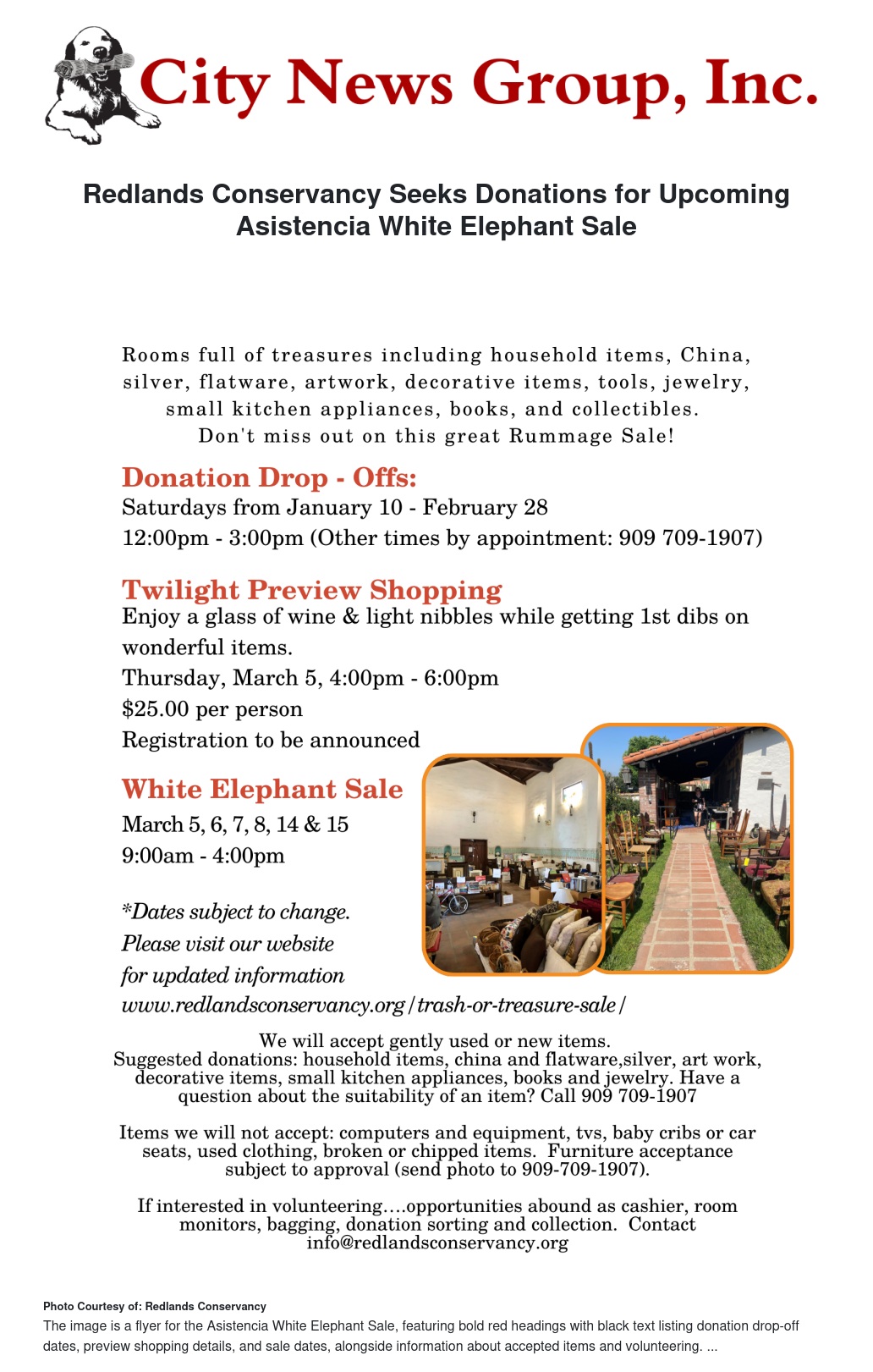 Redlands Conservancy Seeks Donations for Upcoming Asistencia White Elephant Sale by Ruby Stephenson - City News Group, Inc.